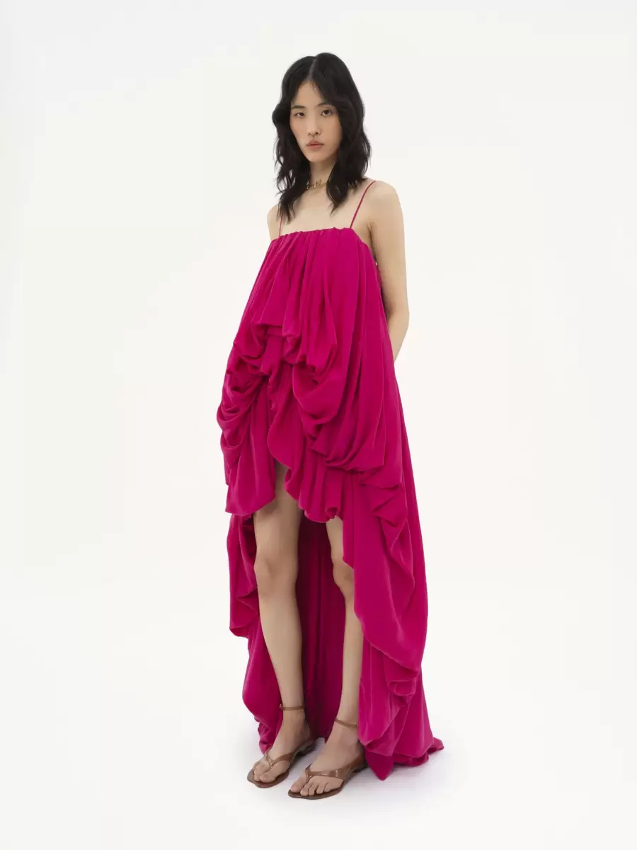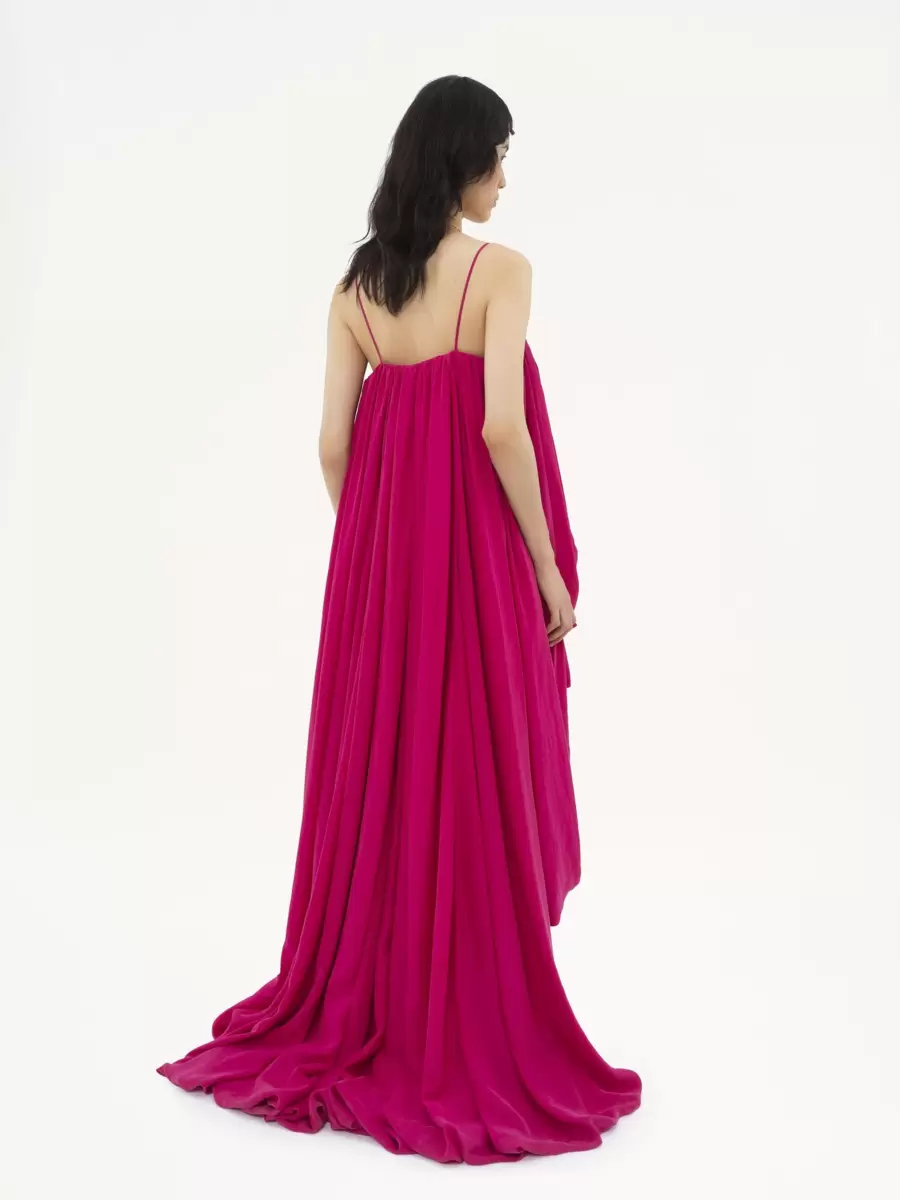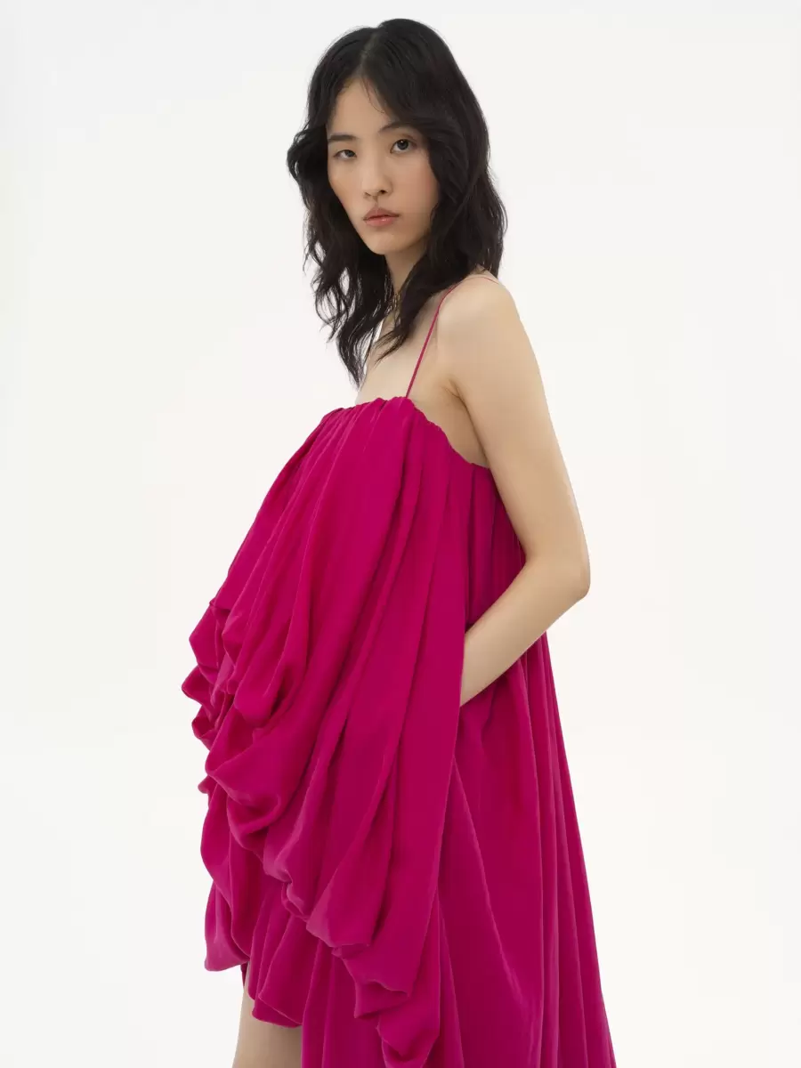 Tuta senza maniche asimmetrica in pongé di seta lavata, che unisce spalline sottili a una silhouette arricciata e svolazzante.