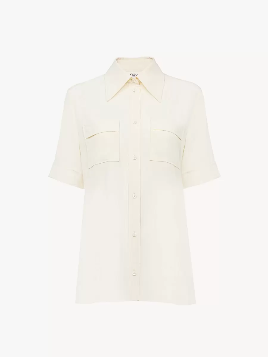 Camicia a maniche corte con colletto in crêpe de chine di seta biologica, con tasche applicate sul davanti e bottoni in madreperla.