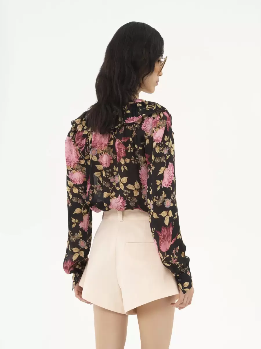 Camicetta con scollo a V e volant in charmeuse di seta biologica con stampa di peonie che affonda le radici nella tradizione della Maison. Dettagli arricciati e balze completano questo capo.