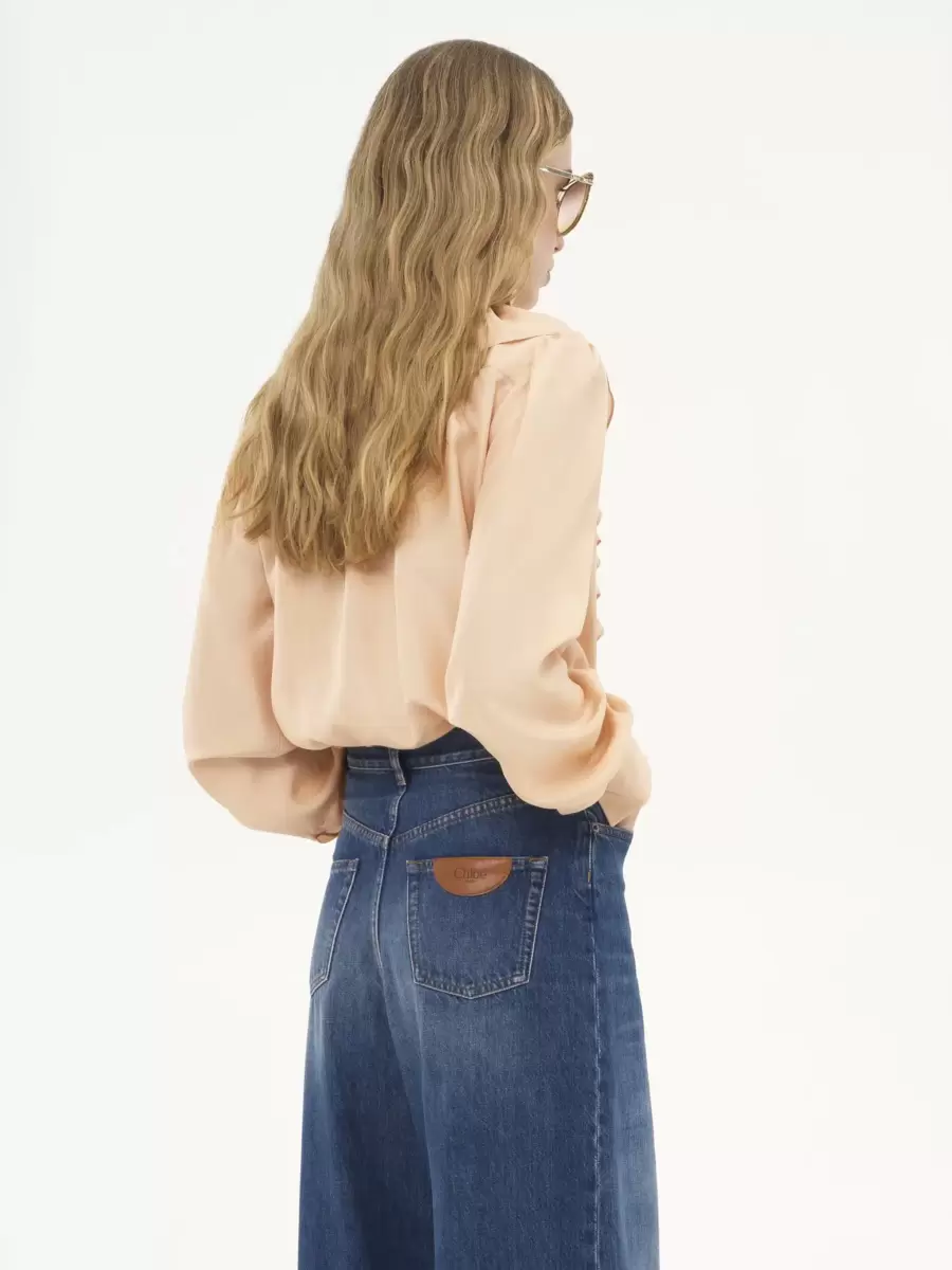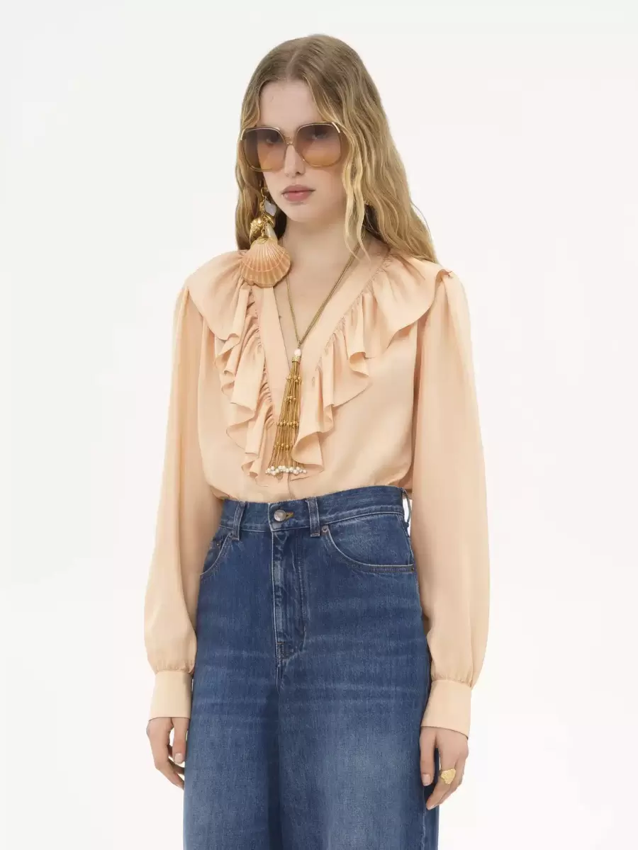 Camicia con scollo a V e volant in morbida seta habotai con dettagli arricciati e balze lungo la scollatura.
