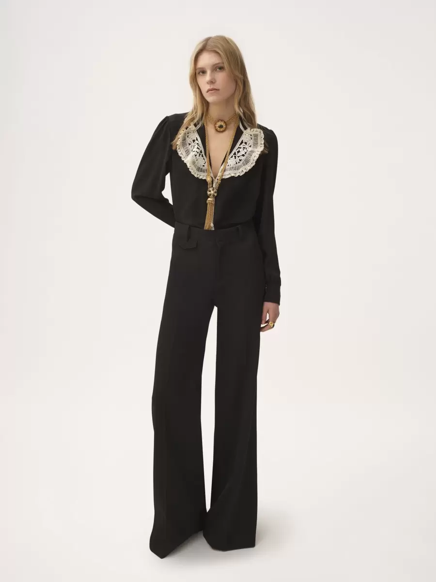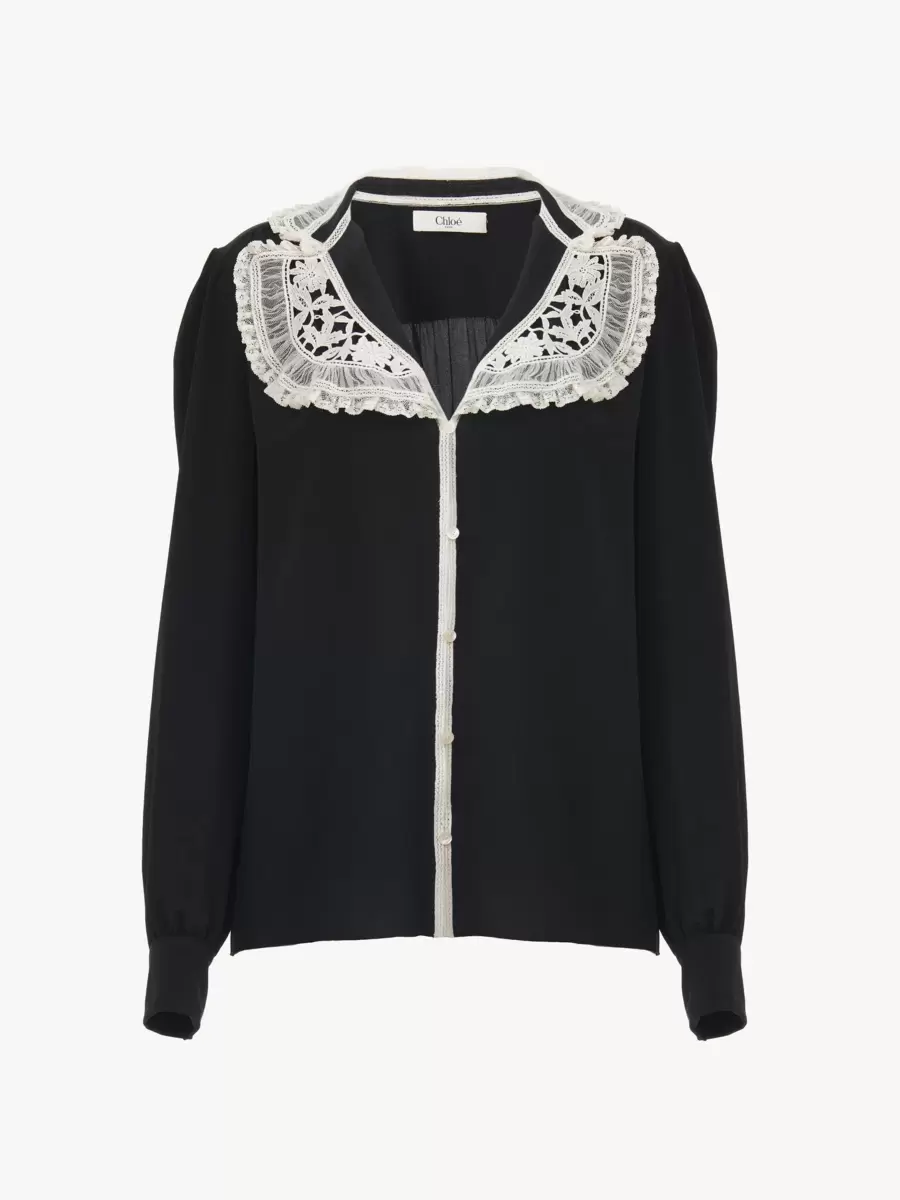Camicetta con volant in crêpe de chine di seta biologica con bordi in pizzo a contrasto sul colletto e sulla patta dei bottoni. Spalle arricciate e bottoni in madreperla completano questa blusa in seta.