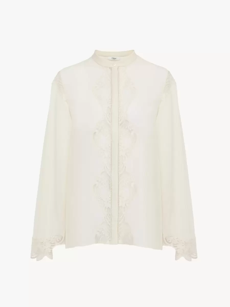 Camicia fluida in georgette di seta biologica, con finiture in pizzo, inserti a jour échelle e bottoni in madreperla.