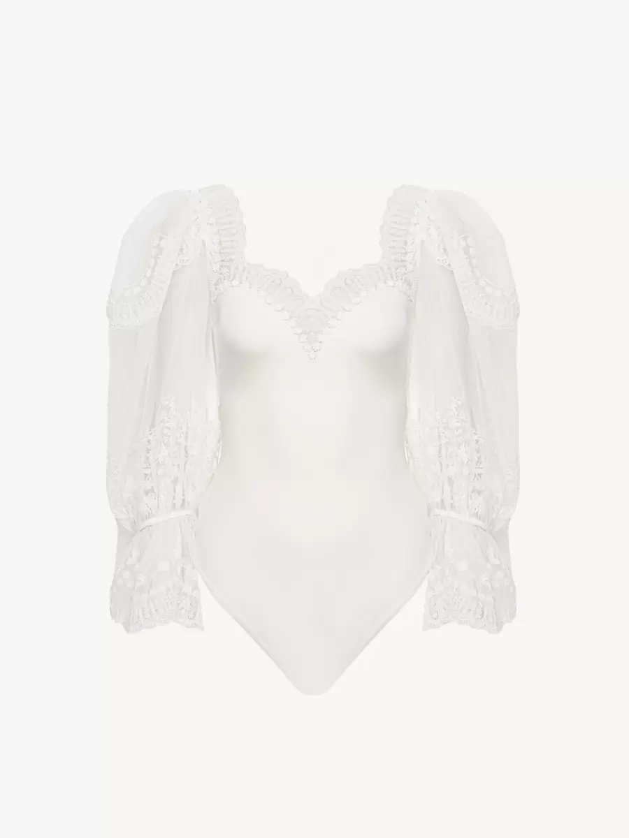 Body aderente in jersey elasticizzato lucido, con maniche a sbuffo trasparenti e finiture in pizzo che richiamano la tradizione della Maison. I lacci pendenti sono rifiniti con punte in metallo dorato.