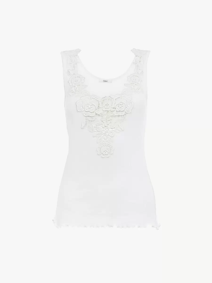 Canotta aderente in jersey di cotone biologico impreziosita da guipure lungo lo scollo e le spalle.