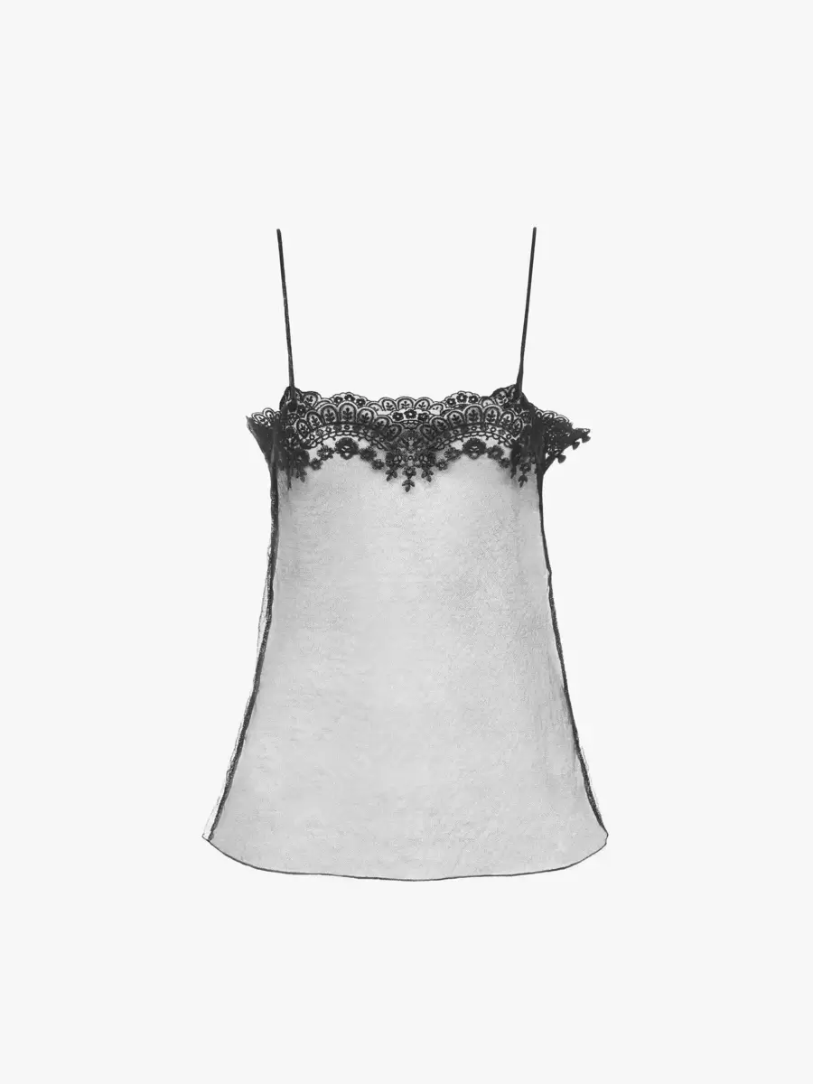 Canotta aderente in misto viscosa trasparente con spalline sottili, pizzo ricamato e bottoni ricoperti in tessuto sui lati.