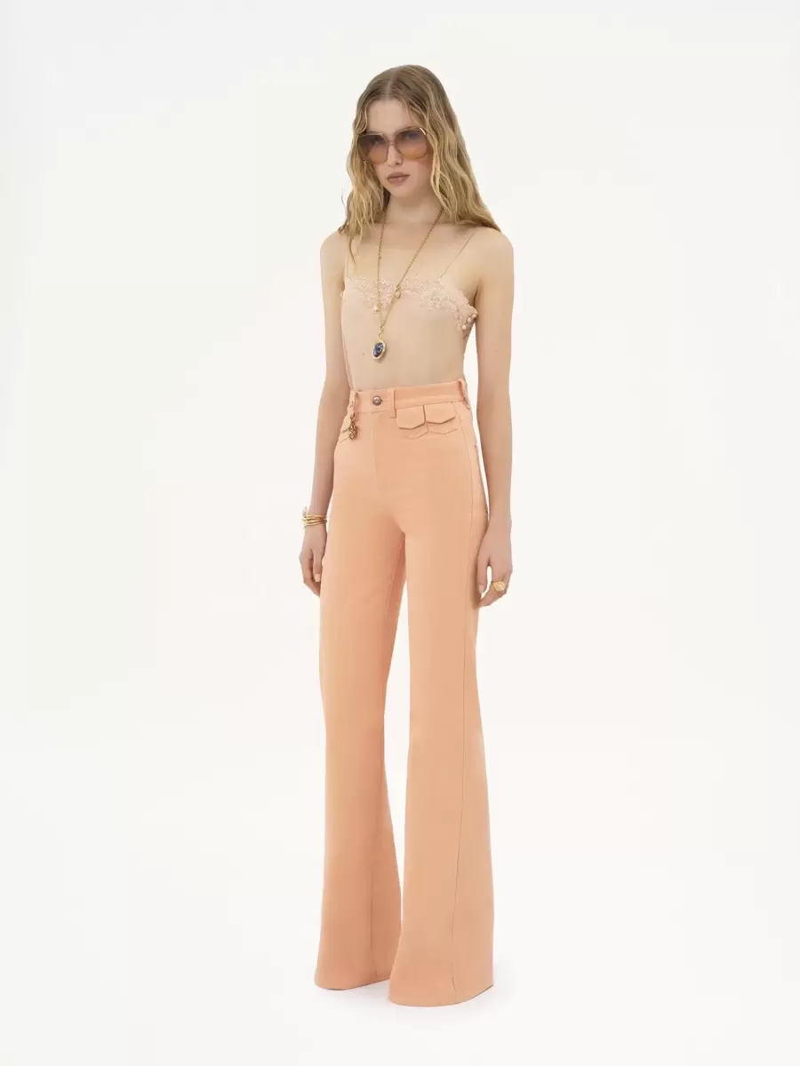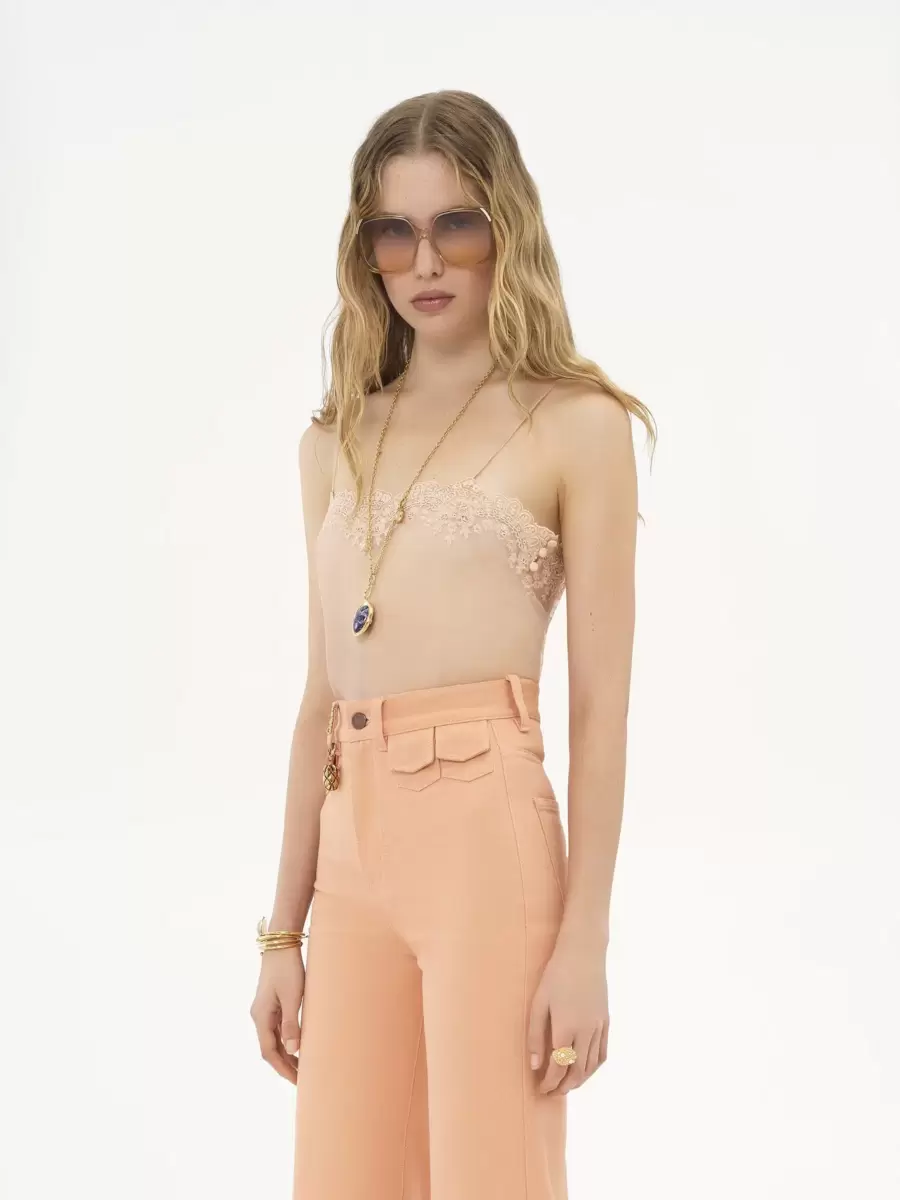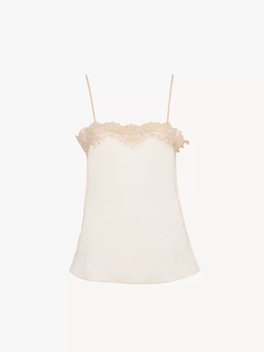 Canotta aderente in misto viscosa trasparente con spalline sottili, pizzo ricamato e bottoni ricoperti in tessuto sui lati.