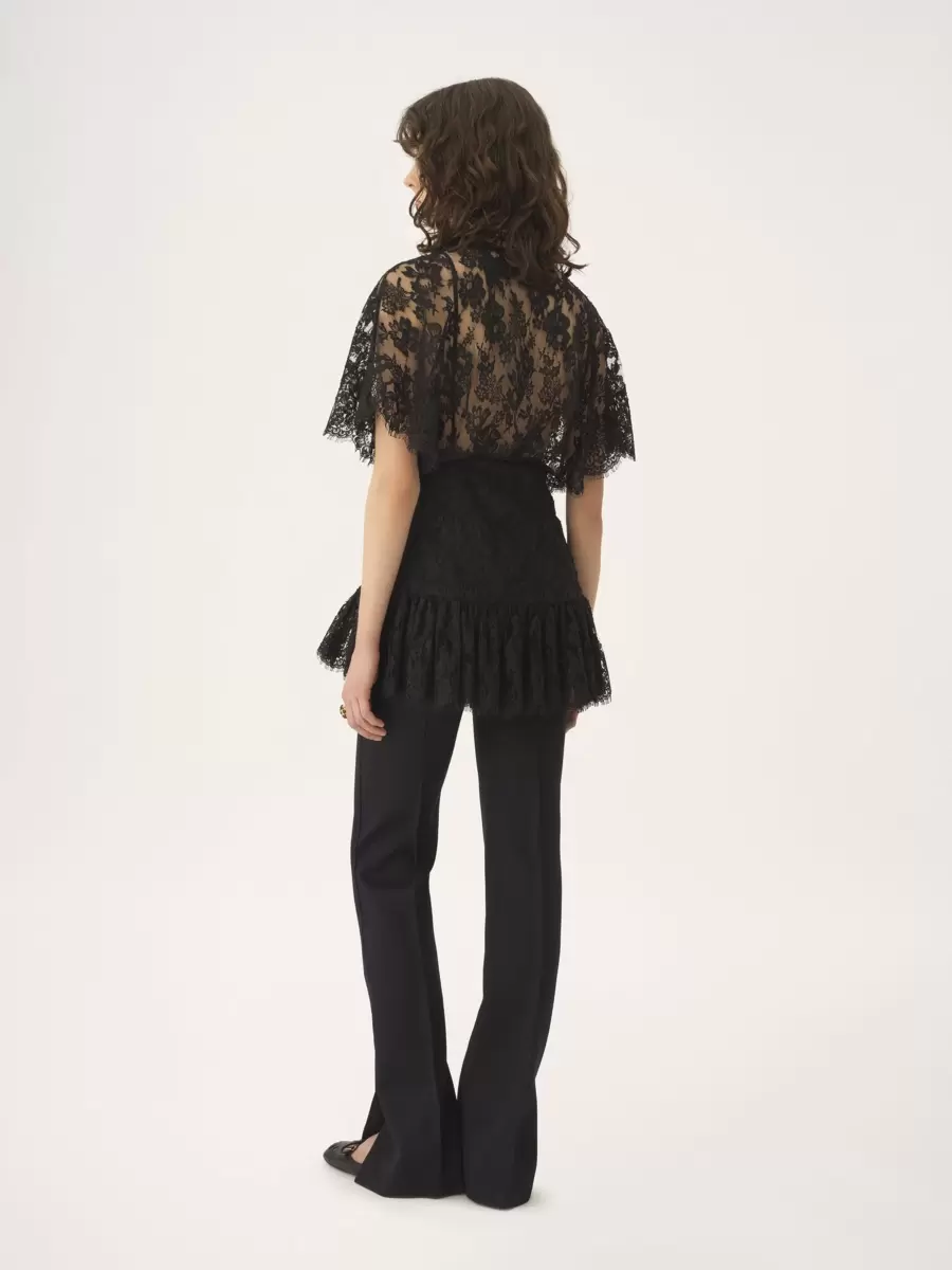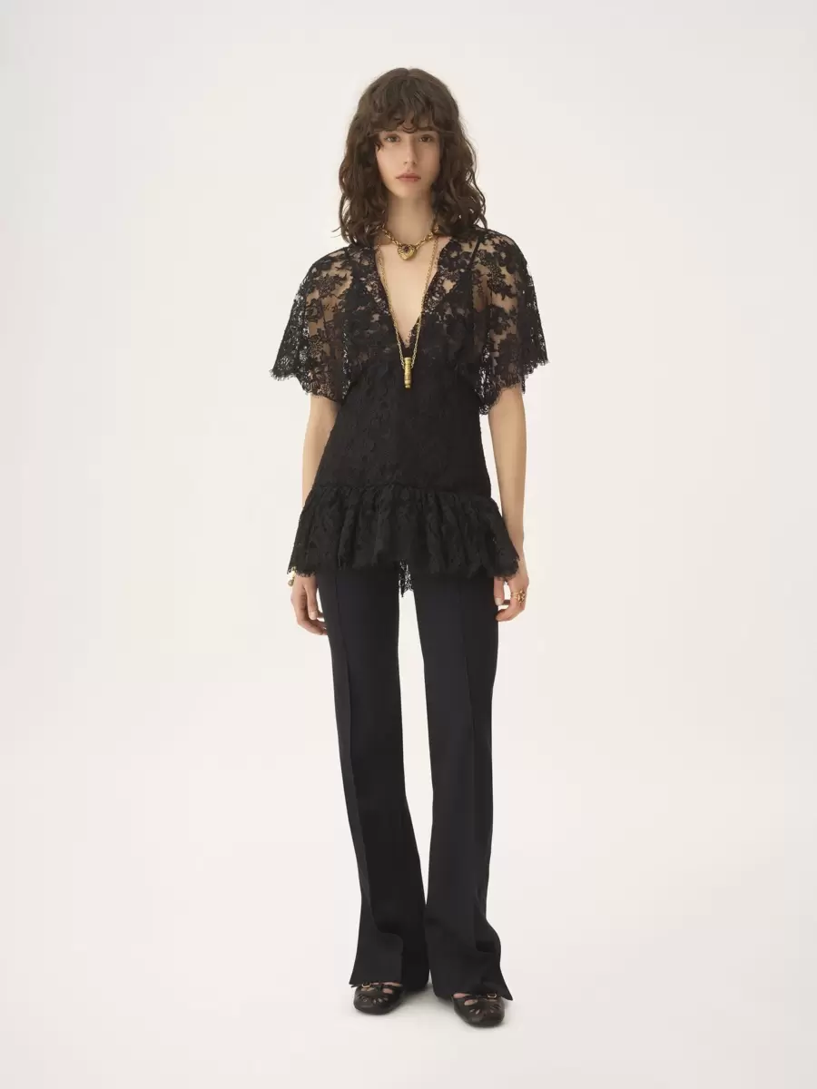 Top aderente con scollo a V e volant in pizzo floreale con fodera in misto seta e orlo a balze.