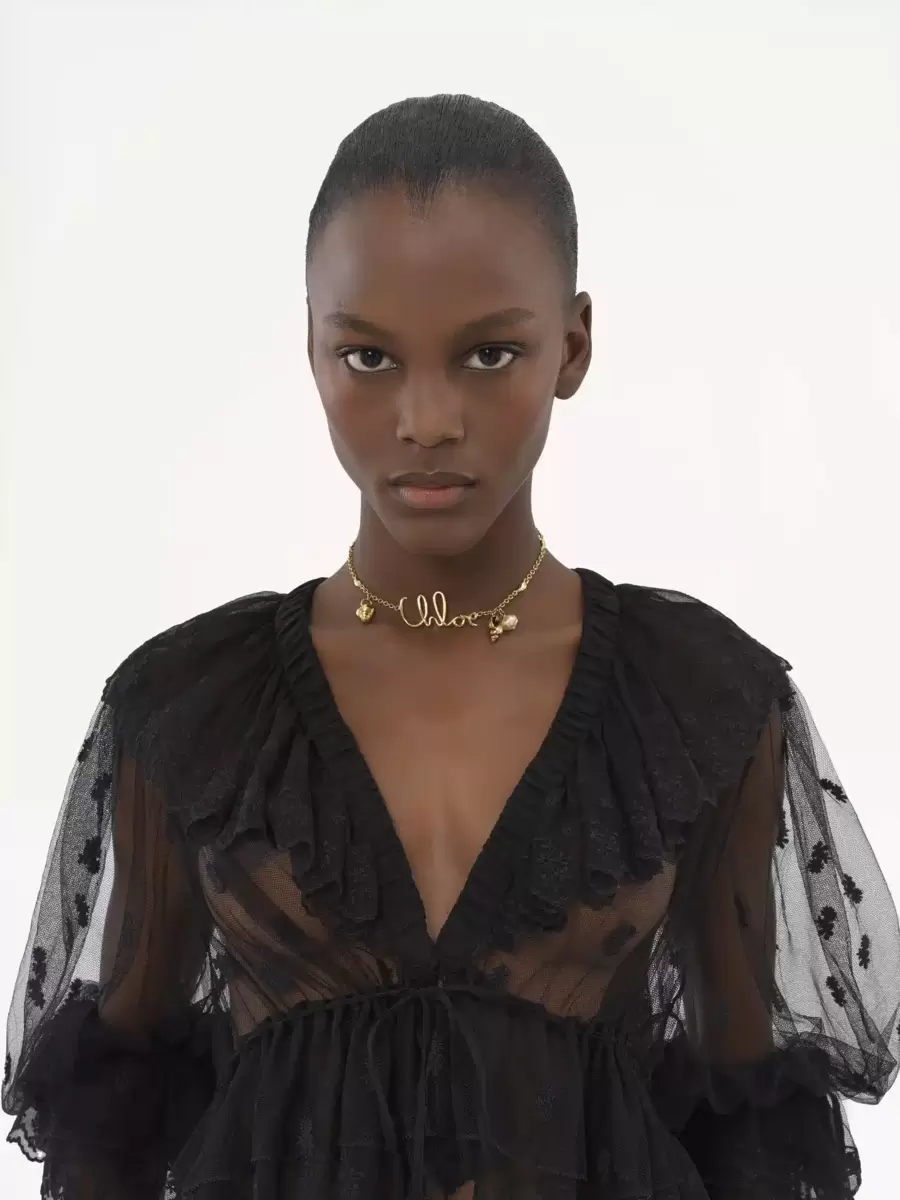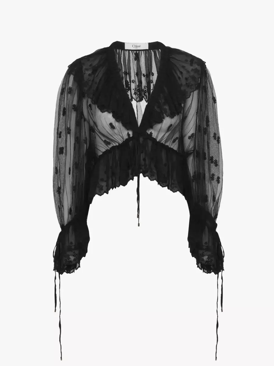 Top con scollo a V e volant in pizzo ricamato ispirato alla tradizione della Maison. La silhouette arricciata presenta volant e coulisse con punte in metallo dorato.