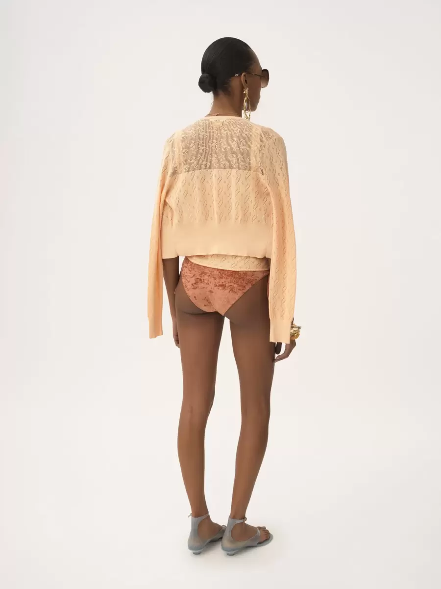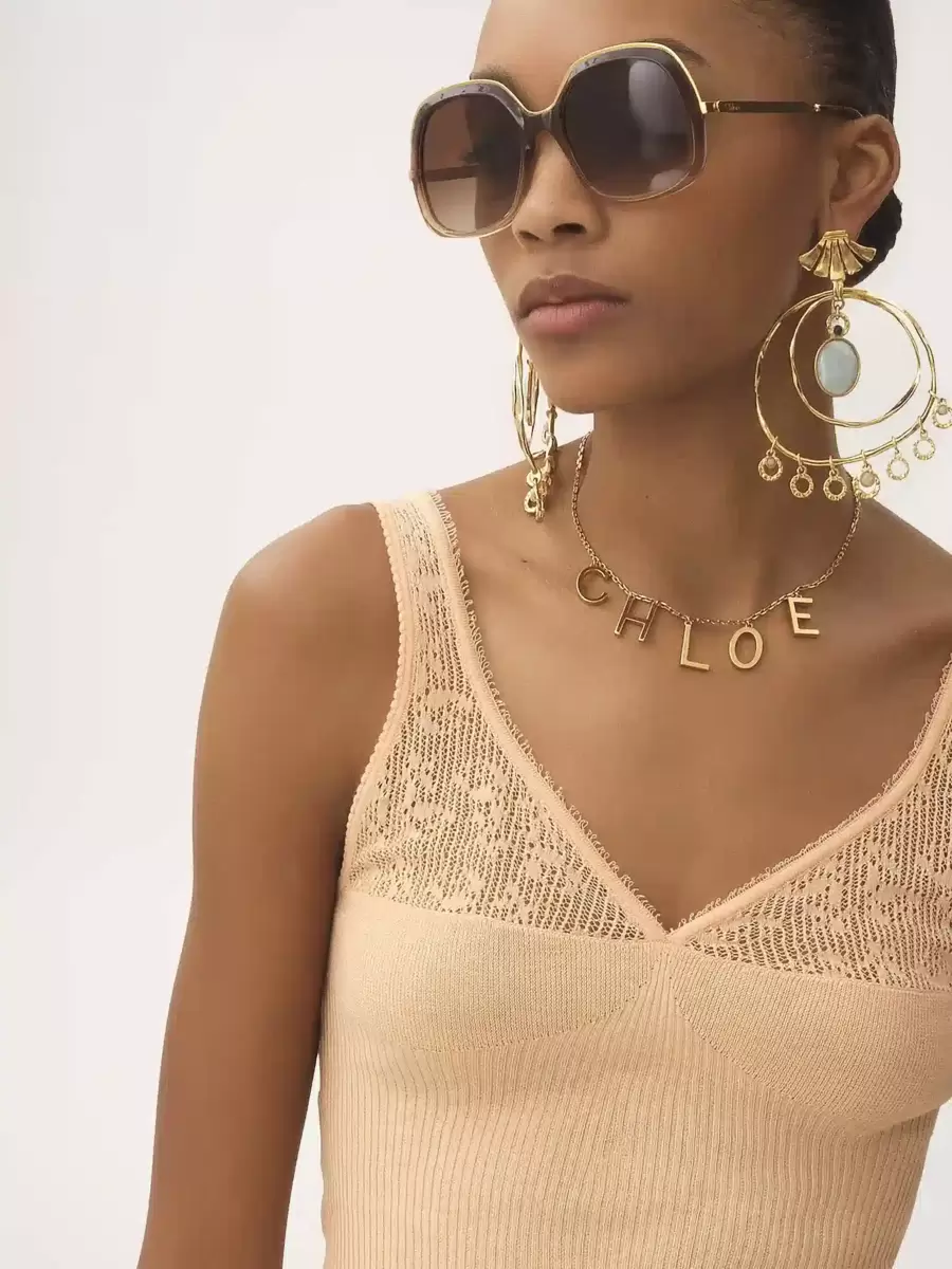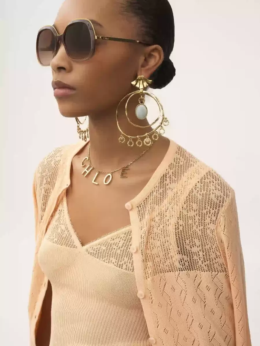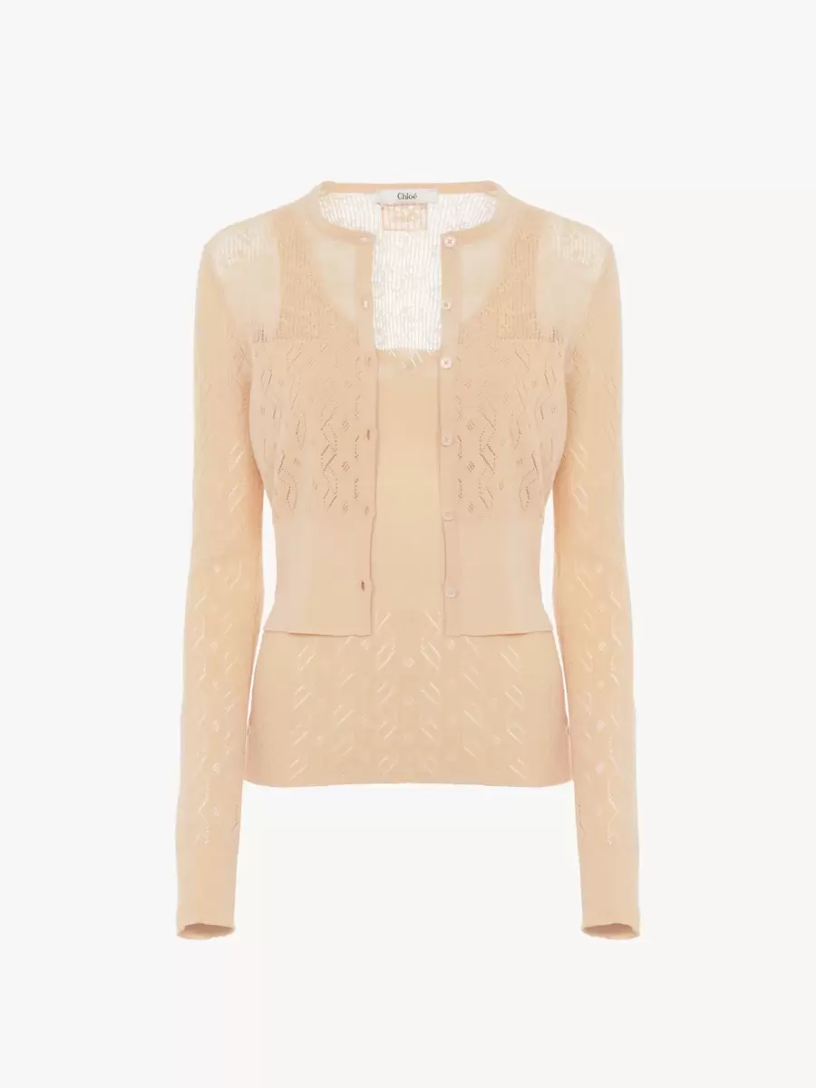 Twin set composto da canotta e cardigan in maglia di cotone traforata con cuciture effetto pizzo e finiture a coste. Bottoni in madreperla impreziosiscono il cardigan, mentre una toppa con logo Chloé impreziosisce il retro di entrambi i capi.