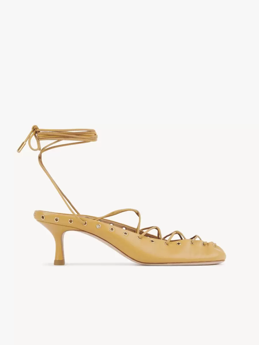 Queste décolleté Chloé Ghillies sono realizzate in pelle di agnello semilucida. Dotate di un tacco a rocchetto curvo, abbinano una punta a mandorla a una silhouette aperta sul retro. L’allacciatura ispirata al corsetto e gli elementi metallici color oro rifiniscono queste décolleté in pelle chiara.