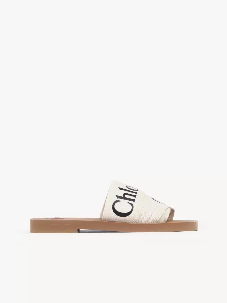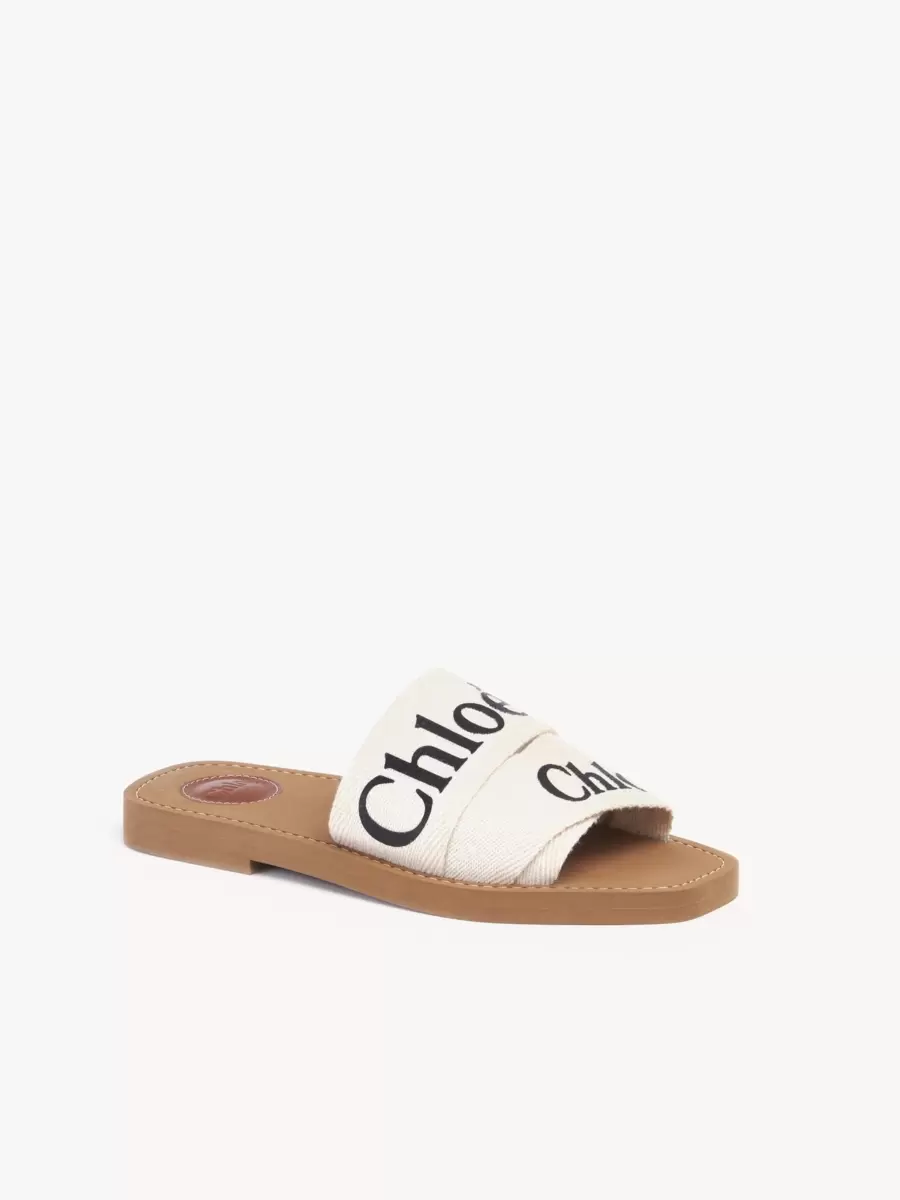 Rivisitata in lino a basso impatto, questa ballerina Woody rivela un gioco di nastri di diverse dimensioni con il logo Chloé in netto contrasto. Insieme, formano una tomaia ampia per una calzata confortevole.