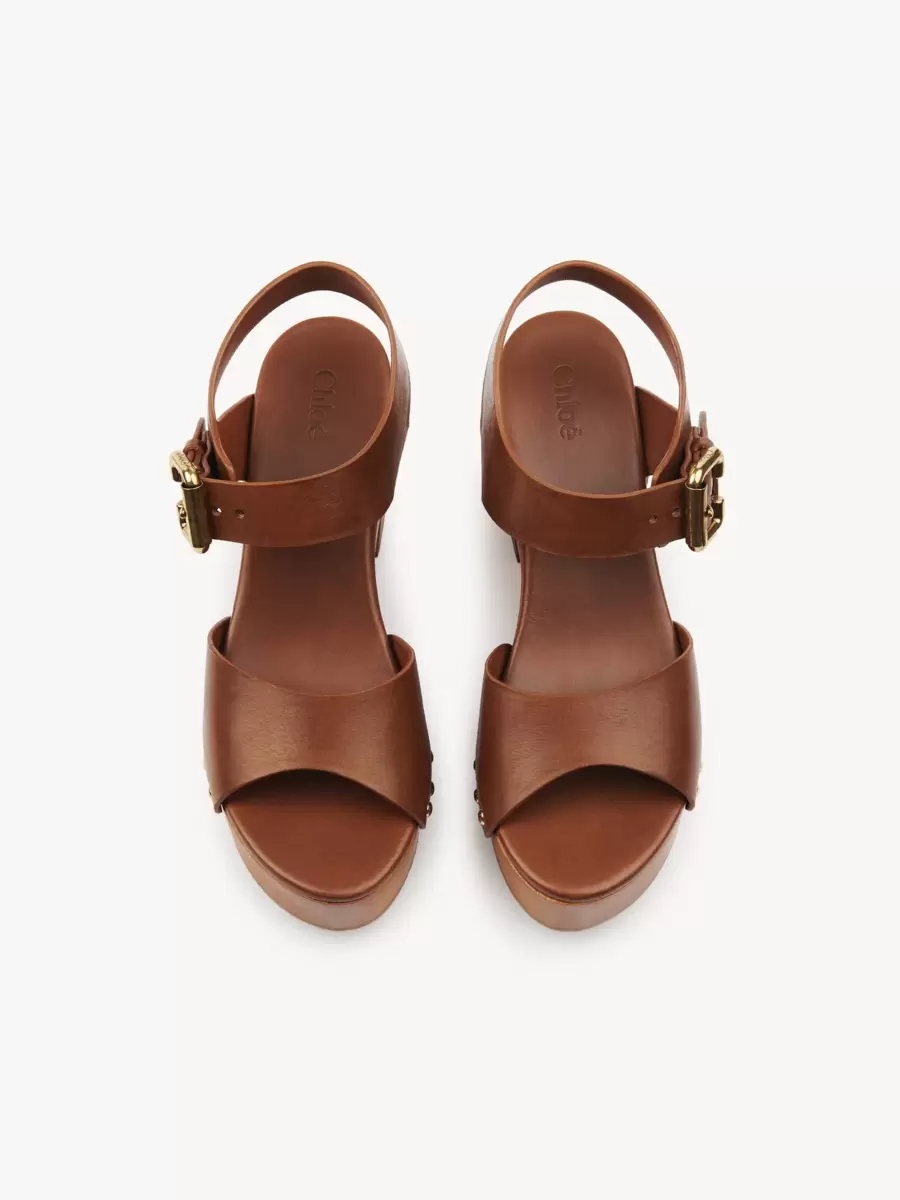 Questi zoccoli con zeppa Jeannette reinterpretano un’iconica forma Chloé in una silhouette più bassa. La tomaia è realizzata in pelle di vitello lucida, combinando un ampio cinturino anteriore e un cinturino regolabile alla caviglia con una struttura in legno con tacco spesso.