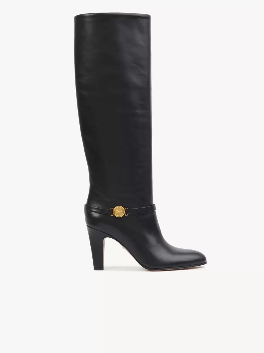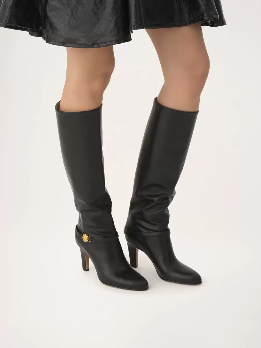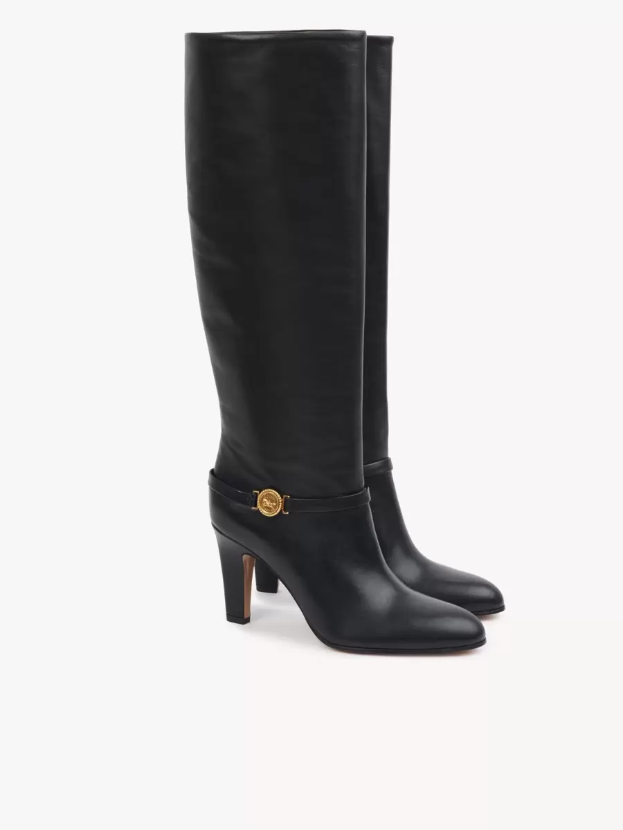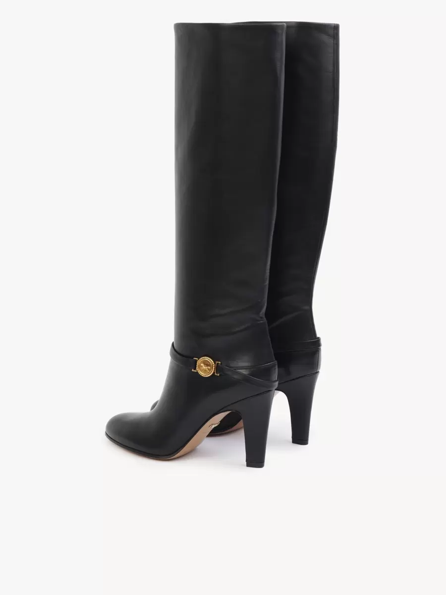 Realizzati in morbida pelle di vitello lucida, gli stivali con tacco Eve combinano un gambale alto a tubo con un tacco affusolato e una classica punta affusolata. Una fascia in pelle intorno alla caviglia è impreziosita dalla medaglia a forma di cavallo color oro, simbolo della Maison.