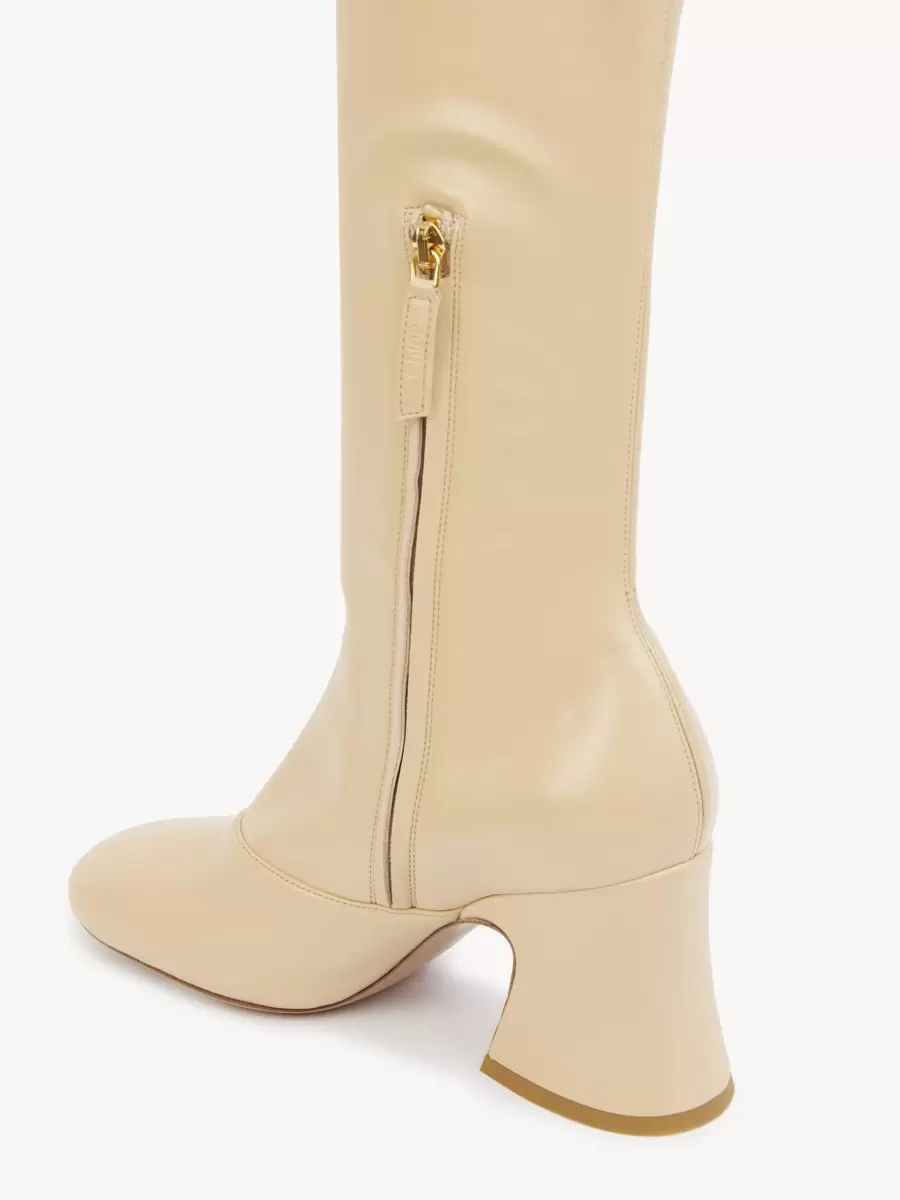 Questi stivali con tacco Janis sono realizzati in morbido tessuto elasticizzato effetto pelle per una calzata perfetta come una seconda pelle. Dotati di un tacco a strati svasato, abbinano una gamba alta a tubo a una sottile punta quadrata.
