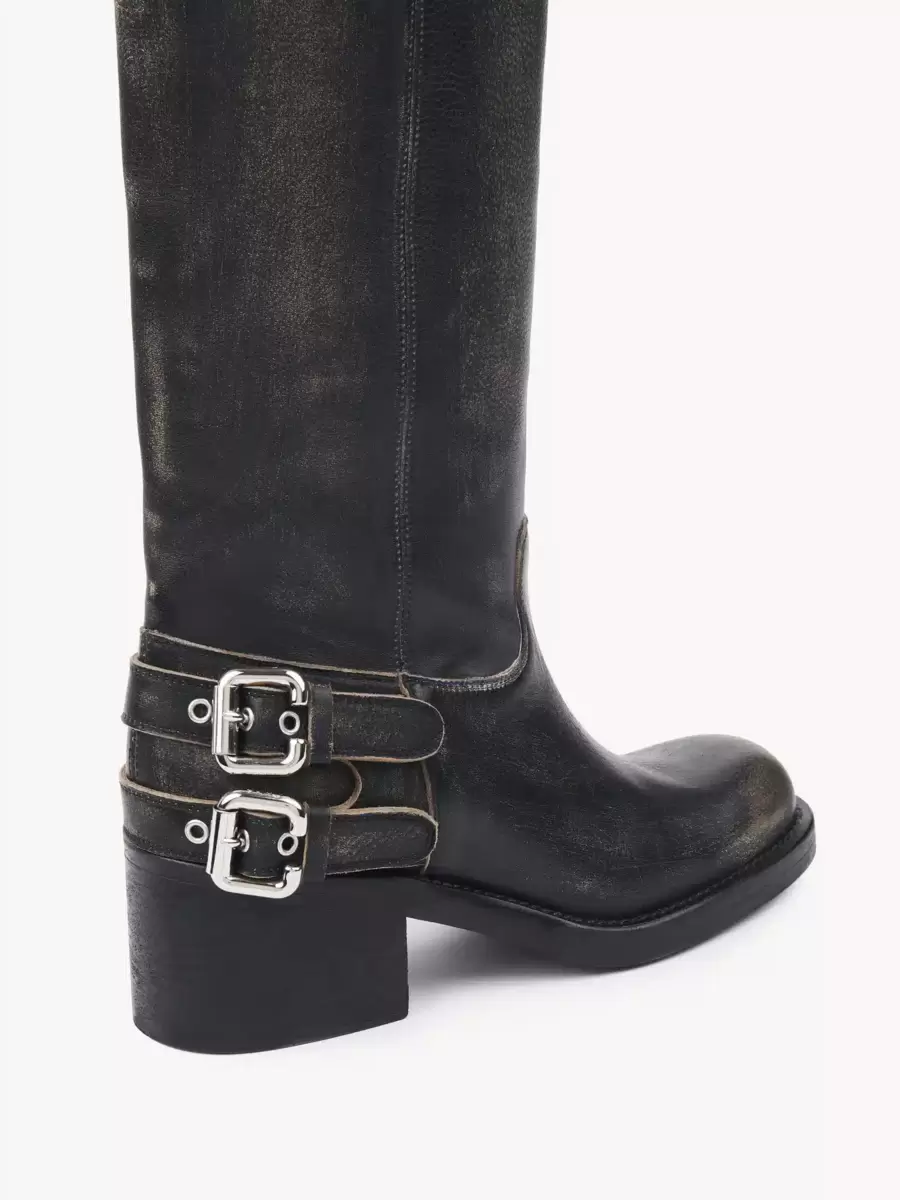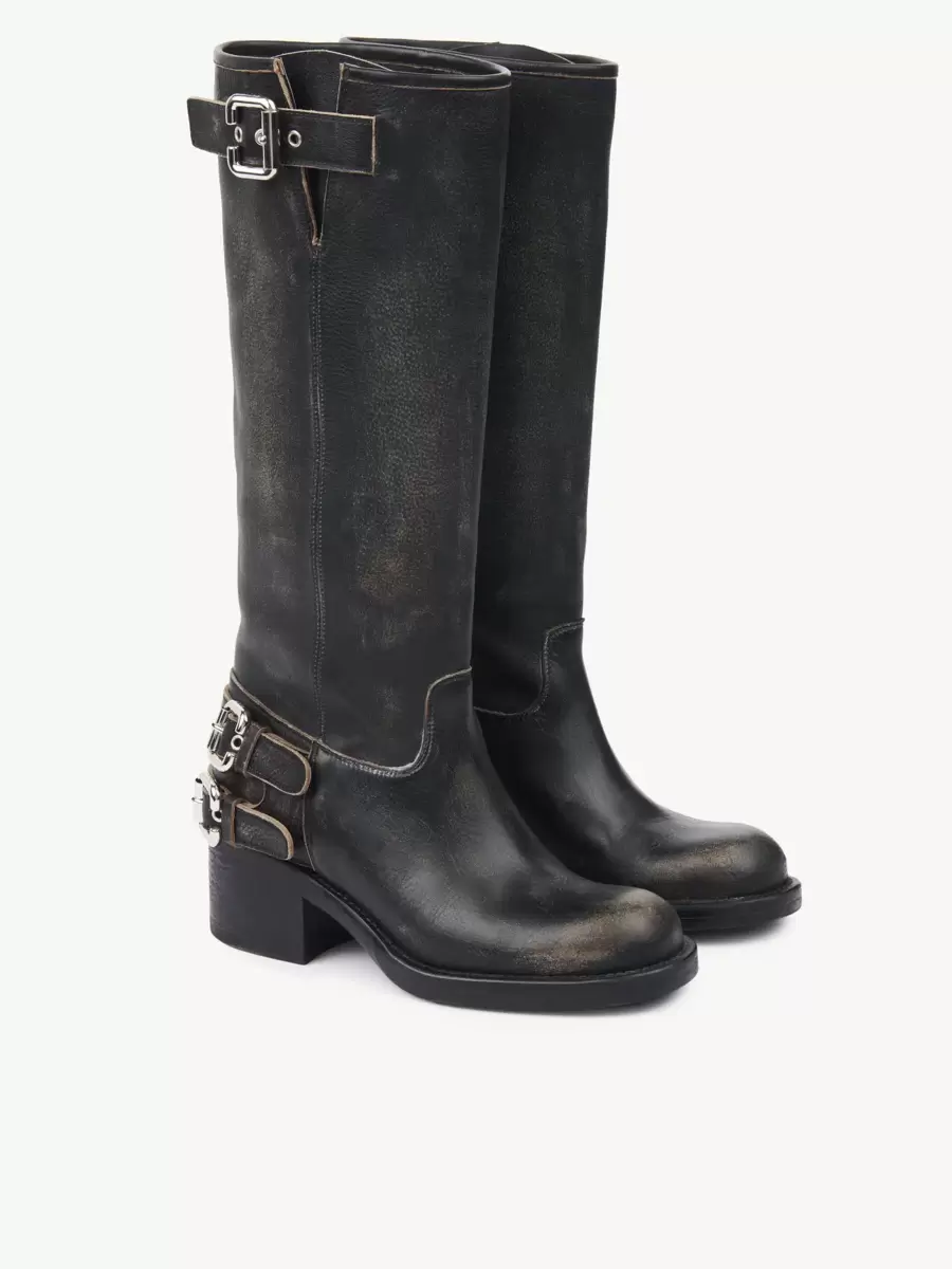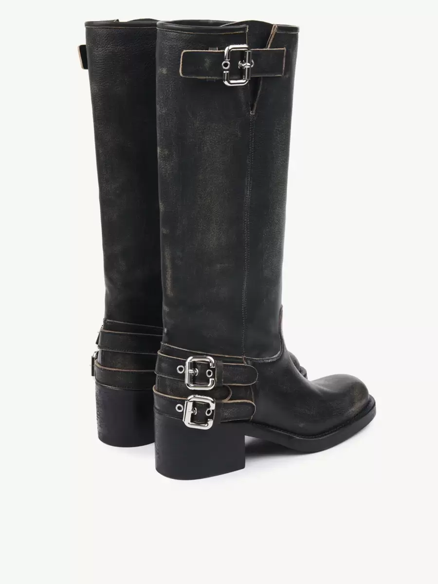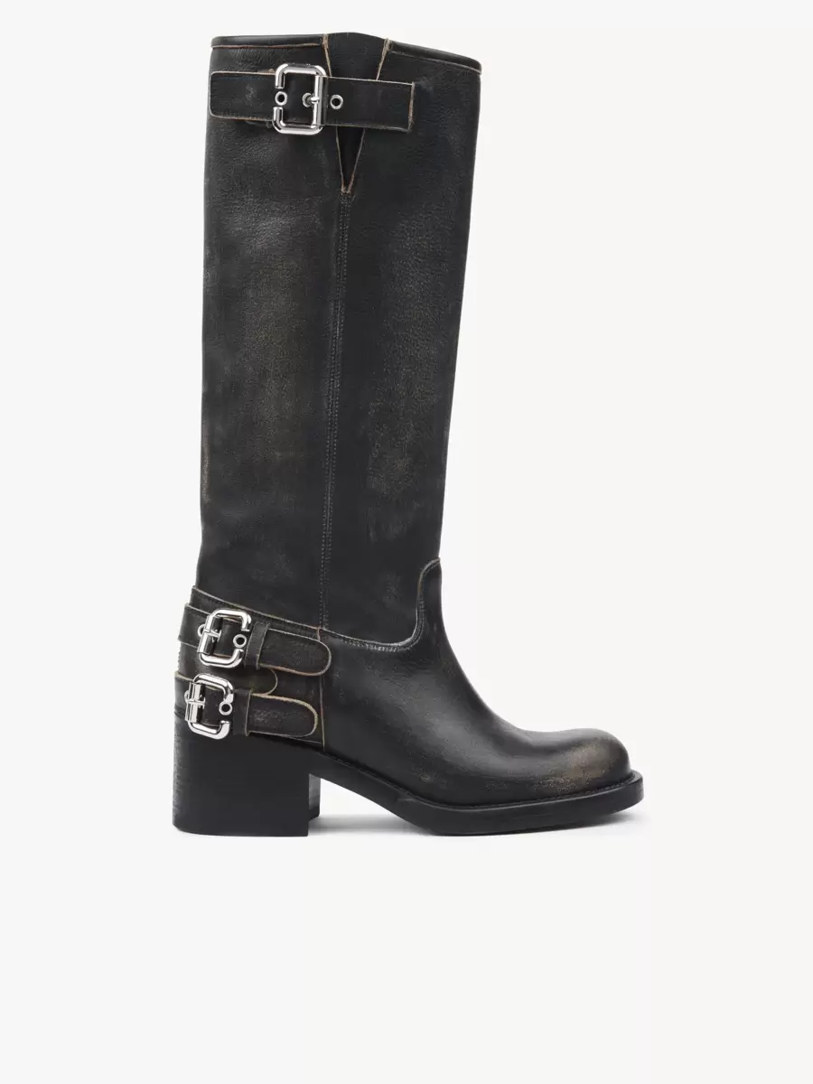 Montati su una robusta struttura in gomma, combinano un gambale alto a tubo con un comodo tacco a strati. Numerose fibbie Paddington color argento rifiniscono questi stivali alti fino al ginocchio.