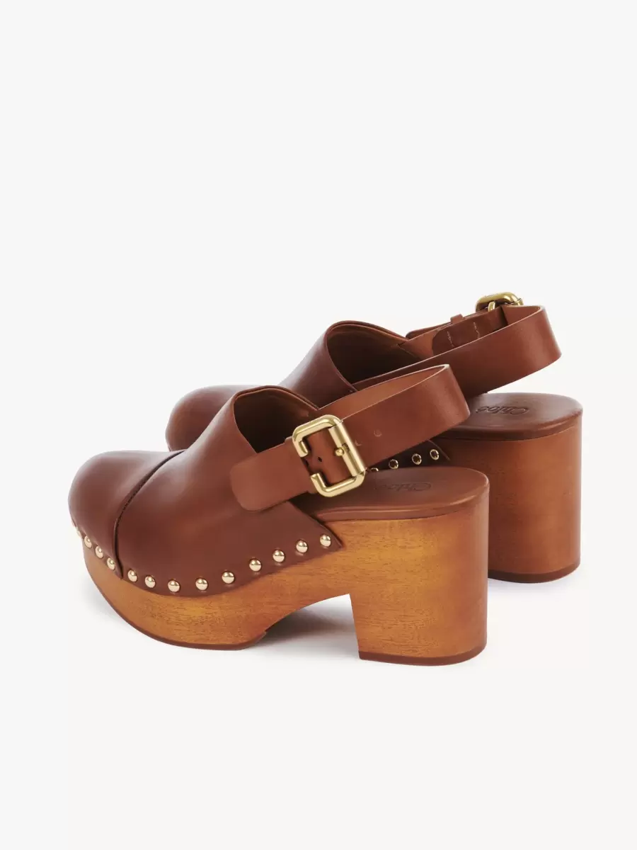 Borchie dorate e una targhetta con il logo Chloé aggiungono dettagli a contrasto, mentre la fibbia Paddington della Maison rifinisce questi zoccoli con zeppa.
